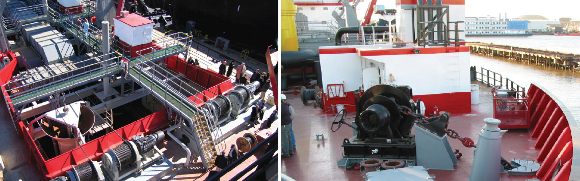 The Draghead winches are rated to pull 150,000 lbs and the Pump winches will pull 57,000 lbs. The winches are designed for the severe, high duty cycle of dredging operations, similar to equipment supplied to Manson in 2006 as shown in the photos above.